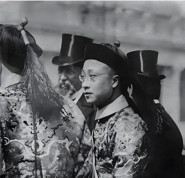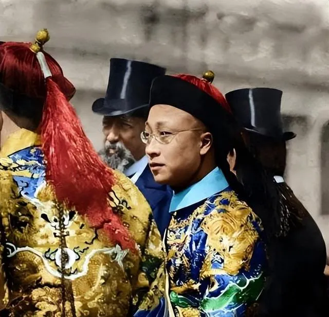 图中戴金丝眼镜的小伙子和旁边一堆高帽子西装人碰头,这画面不常见,清朝衣服一层一层,盘着绣龙,后头礼帽黑得发亮,两国人站一块儿,大家瞟来瞟去,谁都不松气,真像两种故事里的主角硬拉一场戏,那位官员蓝色朝服一亮出来,整个人立马撑住气场,眼镜一蹭,古旧和新鲜一下全出来了,小时候还真以为那时候穿官服的都年纪大,看到这个年轻人,才发现“人和时代,就是这么一点点窜上去的”。