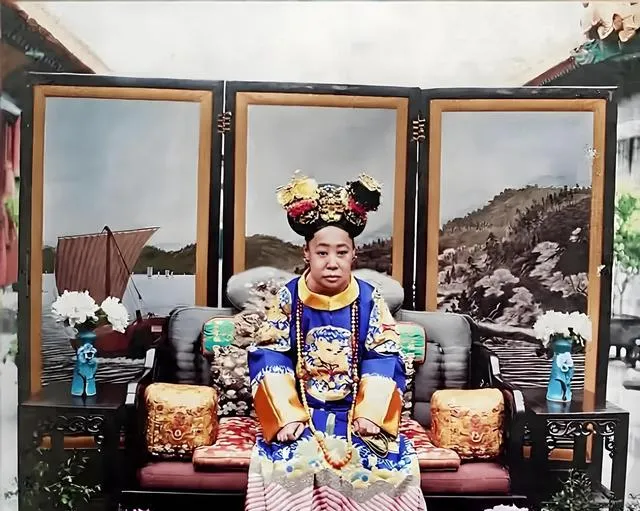 坐像这张,女眷弄了大头花,穿着锦缎,前襟压着团龙,看似规矩,其实每一块布都讲究,袖口、裙边全用上了,手规规矩矩摆在膝前,屋子里的屏风画山水,靠背上垫着小门垫,一点不乱,奶奶说“衣服穿得沉,心要定,坐才沉得住”,照片看多了才懂,老一辈不靠家底撑场面,都是靠身上的气度抢眼,彩色一铺上,更能看见珠子和云肩的分量。