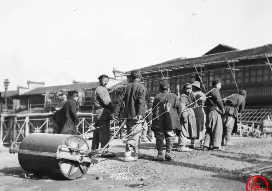 这个铁墩子叫压路碾子,一帮工人扎着腰带推着拉着,铁家伙咕噜噜前头碾过去,路面被踏得结结实实,是碎石路,不是柏油也不是泥巴,鞋踩上去估计还能脆脆响,好多人头一回见,忍不住回头望一眼,路修好就是大手笔,得出几身汗,现在修路都是机器了,这力气活见得少。