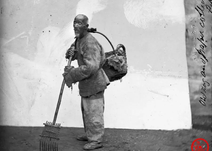 这个背着篮子的老人专门收字纸破书,清朝有“敬字惜纸”,写了字的废纸不随便扔,也不能糊窗户,专人收走集中焚烧,遇上穿堂风大还得守着,怕火星乱飞,小时候家里爷爷留着一大捆废账册,舍不得点,说上头有字,现在废品回收站进屋就扒拉走一堆,哪还有这规矩,老规矩守到头也会淡下来。