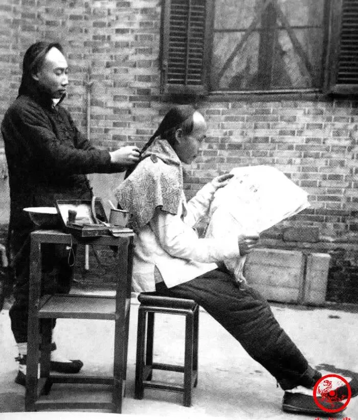 这画面一下勾回记忆,剃头的师傅站着,客人一手报纸一手托着脑袋,大辫子垂着,剃额头得精致点,老辫子动不得,传说清朝男人发辫能熏人不是没来由,十天半个月才洗一次,剃头当天才顺道一泡水,报纸已经进百姓家了,我爷爷说小时候剃头一次就得坐稳,顺带能打听街坊大事,现在美发店香喷喷的,想洗头随时都行,那会儿洗一次头能掀起全家讨论。