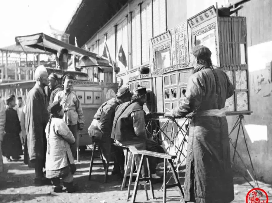 这一组桌子一围,木箱子前凑一堆人,西洋镜头里放着画片,看一眼得掏两文,孩子抢着凑前头,大人顺便打听点消息,那会儿什么都新奇,“看过西洋镜的都是见过世面的人”,我家老舅说头回钻窗户后头看见武松打虎就回不来了,现在VR、影厅满大街,谁还会抢着花钱往里钻,小东西一度可把人新鲜够呛。