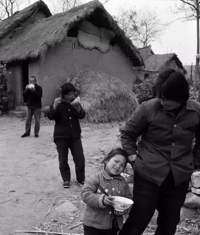 看这张院子前草房子,墙皮掉得七七八八,屋檐下晾着褂子,小丫头端着只大碗,脸上沾着点饭渍,身后女人笑着走过来,村里谁家要是做饭总少不了这景,锅碗瓢盆全在手上,说给下一辈听,人和房子都不讲究装饰,院子里刮西北风,锅里咕嘟炖白菜,有点饿有点踏实,这就是日子的底色。