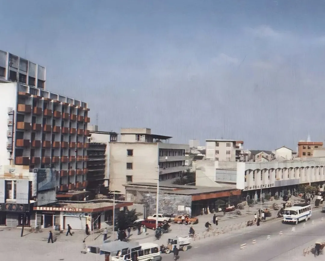 图中最显眼的这栋大厦,那会儿在城里算得上拔尖的“高层”,楼外一格一格突出的阳台,红棕色窗板每一排像棋盘子,谁家要是亲戚在里头上班,都觉得脸上有光,这种大厦说不上多豪华,门口柱子刷了灰白色,招牌下头晚上会亮灯,小时候冬天跟家里人来赶集,从这儿穿过去,路边总有卖糖人和汽水的摊子。
