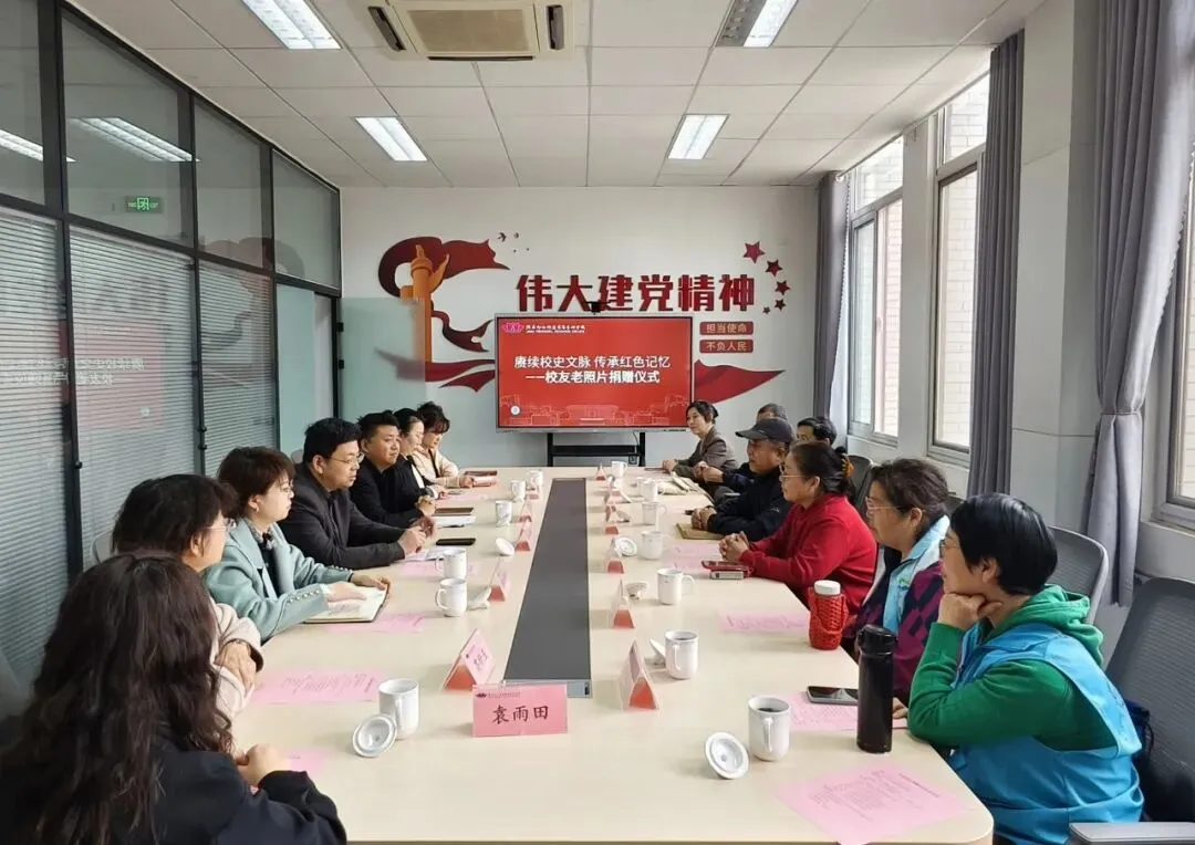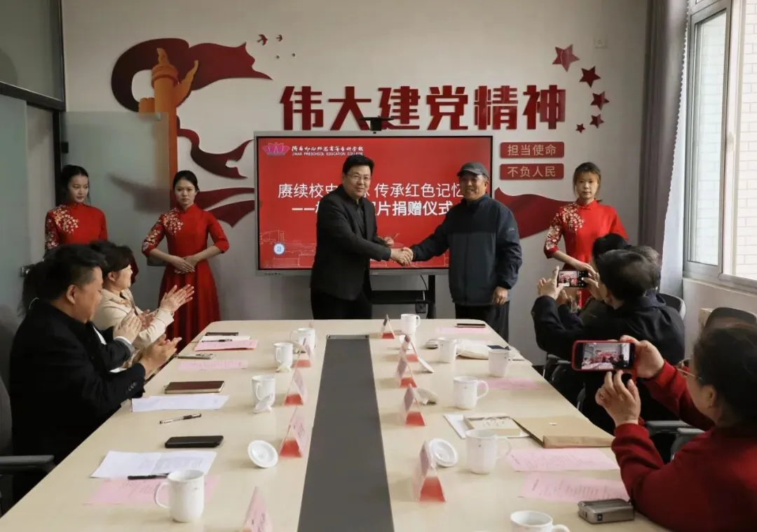 仪式上,张成强首先介绍了学校的基本情况及近年来的发展成就。随后,校友亲属代表张志毅深情讲述了照片背后的故事,表达了将这份家族珍藏交由学校保存、让校史更加鲜活完整的美好心愿。他动情地说:“今天,我完成了一件心愿,作为济师校友的后人,替父亲把他在济师军乐队的青春,郑重交还给了母校,这份捐赠不仅仅是两张泛黄的照片,更是一段鲜活的校史回归,最起码让人们知道70多年前,济师就有军乐队的存在。一张张照片凝聚着父辈的求学岁月,也折射出学校厚重的历史。看着照片中意气风发的父亲和小伙伴们,仿佛还能听到当年嘹亮的号角声。愿这些珍贵的历史影像资料如良驹识途,为济师校史添彩,也愿济师精神弦歌不断、文脉永续,让这份记忆在校史馆的灯光下,继续温暖一代又一代的济师人。”
