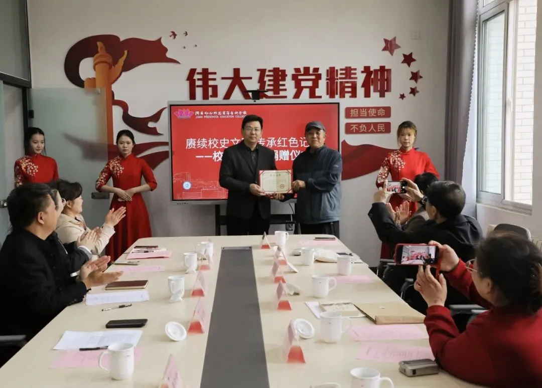 这张弥足珍贵的老照片拍摄于1949年,记录了我校前身——济南师范学校军乐队的集体合影。作为学校早期校园生活的生动缩影,它不仅承载着厚重的历史记忆,更见证了学校薪火相传的办学历程。在热烈的掌声中,老照片正式移交学校,张成强代表学校向张志毅颁发捐赠证书。
