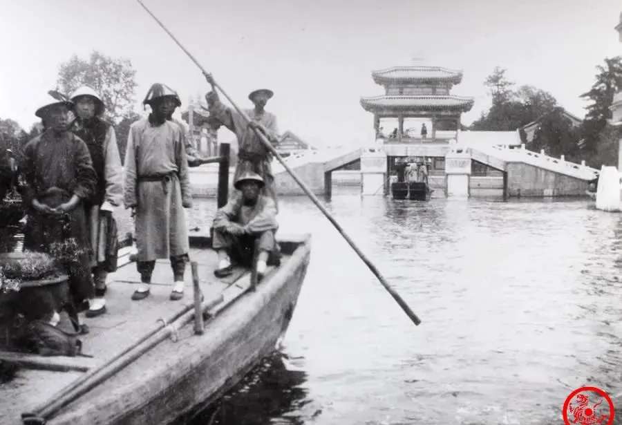 这个画面里,几位太监和差役撑着木船,衣服松松垮垮,草帽一戴,歪着身子看着岸上,远处是颐和园的桥和楼,水面宽,船晃悠悠,干的活也不急不躁,据说这是清晨出来查湖面卫生,扫落叶,保湖水干净,太监上工没啥“正经架势”,更多是坐着说笑,清廷那会儿宫里太监地位特殊,吃穿不少讲究,闲暇时候还偷着自在,他们的日子和寻常的普通百姓比起来,真不是一个味道。