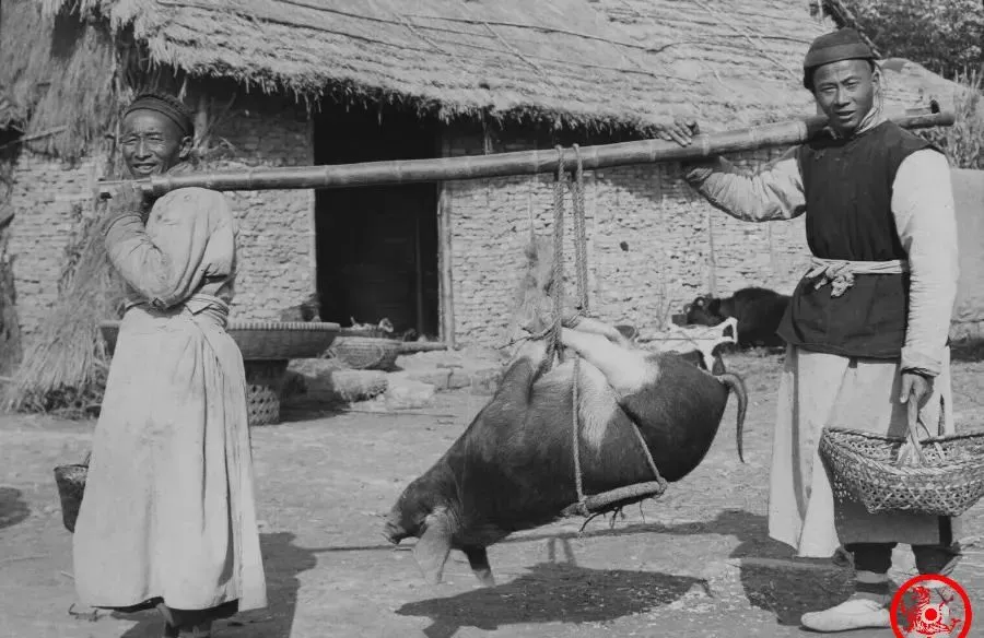 这个场景熟,家里以前也见过,农民用结实的扁担,搭着绳子,活生生把一头膘肥的猪吊在中间,俩人一左一右扛着,手里还搭着竹篮子,脸上有点小得意,估计这猪养了一年半载,是家里主要“存款”,赶集天一早出门,不舍得轻易宰,都是拿到集市上卖个好价钱,印象最深的就是路上猪哼哼唧唧,二人肩膀咯得通红,回家头一件事就是往热水里泡一泡肩窝,“卖了猪,买点盐买点布,家里头又热闹几天”,奶奶以前总这么说。