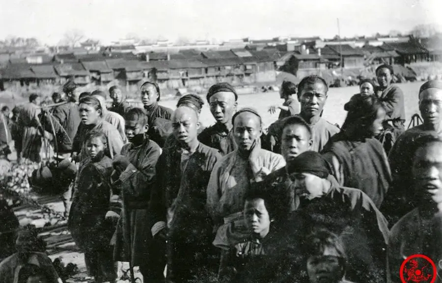 这一群人,神情都写在脸上,盯着镜头看,各种打量,有好奇有小心,一眼能看出来,那时老百姓没见过洋人,更没见过照相机,“这会冒烟的家伙,到底能干啥呢”,站在前头的小心翼翼,后边的伸长脖子,拍一张照片就把这帮人的样子定住了,可笑的是,自己成了别人镜头里的新鲜物件,现在咱手机里咔咔一堆照片,那时候有张全家福都能裱玻璃框挂大墙头,可惜这帮人可能一辈子都没见过自己的影像。