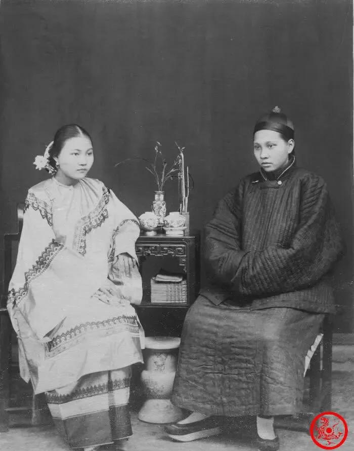 这两人一柔一刚,左边穿裙子的姑娘,小脚藏布袜里,坐姿规规矩矩,手指细长,气质柔弱,右边是短衣男装,脚下是“一双天足”,端坐时眉眼透着股英气,这种对比小时候听老人说过,“那会裹小脚的多,敢穿男装的是胆子大的”,合影时候不让笑,表情刻意板着,看着却透出一股旧社会的腔调,女孩子们那时活法差得不少,左边仿佛活在家宴小厅室,右边能直接上街抬担子。