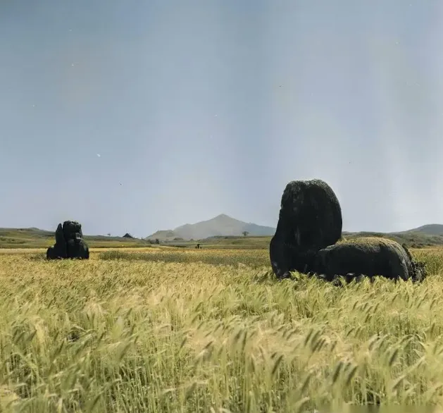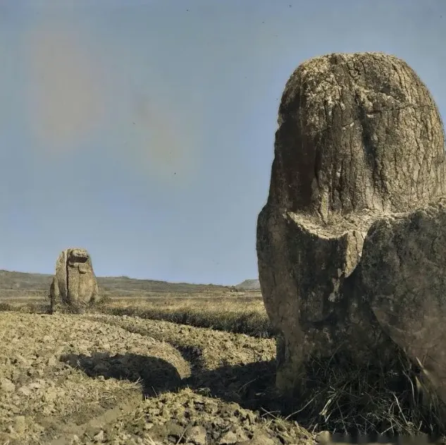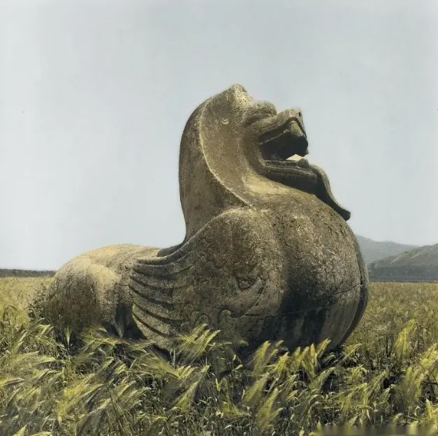 ▲南京东北郊的一对南朝石刻辟邪,被麦田包围。
