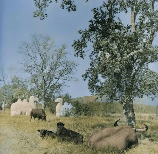 ▲南京东北郊的另一对南朝石刻辟邪,周遭似乎并非农田,而是荒草。