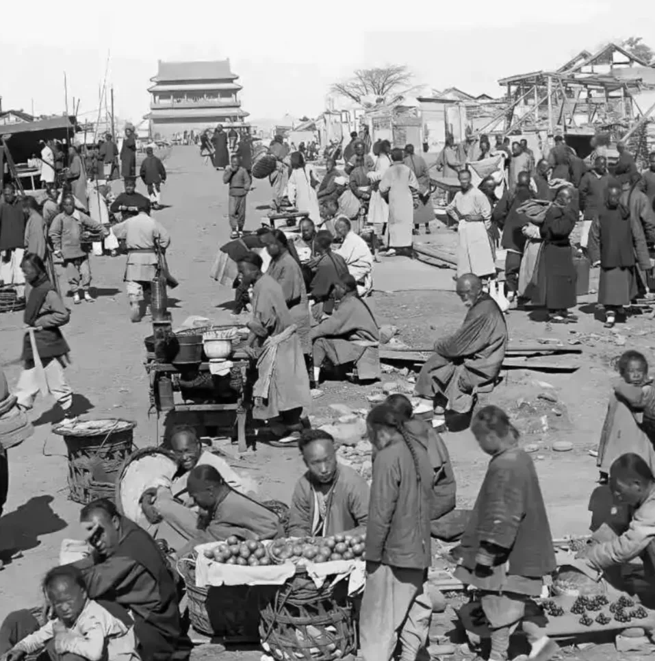 这张图里市井气扑面,街道土色一片,人头攒动,全是黑脸汉子,大多穿着宽大旧棉袍,东西虽然杂,但说不上丰富,一个个摊位上多是水果、蔬菜,小孩子举着篮子、老人端着碗,忙着讨价还价,空气里估计飘着炸油糕和锅巴菜的味道,小时候奶奶总说,那年月没什么绿树遮,地皮晒得也黑,人晒得更黑,进了集上你一眼望过去,都是一种色调。