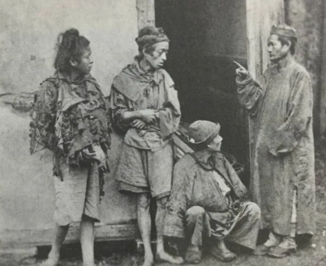 这个画面叫人看着发紧,瘦骨嶙峋的四个人,有的弯腰蹲地,有的斜靠墙边,一身破布,腿上套着补丁裤脚,打着赤脚,他们聚在门口也不知是在凑什么热闹,随口几句话就是家里揭不开锅,小时候爷爷说,那时家里来了朋友,就着糠粑和冷水也算一顿伙饭,谁家都不宽裕,有种“大家都一样”的凑合劲。