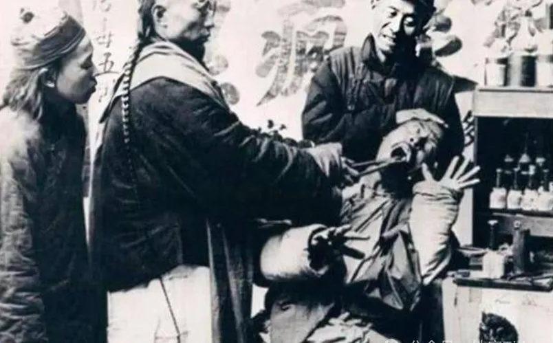 这叫街头牙医摊,真正的苦差事,只见穿长衫的大夫双手夹住病人脑袋,还有个壮汉按住肩膀,旁边人瞪着眼看热闹,病人口张最大,叫也叫不出来,没有麻醉,没有消毒,全凭壮胆和狠劲,以前村里谁牙疼,家里人说实在不行去剜剜,咬块毛巾忍过去,这种活法现在孩子们根本想不到。