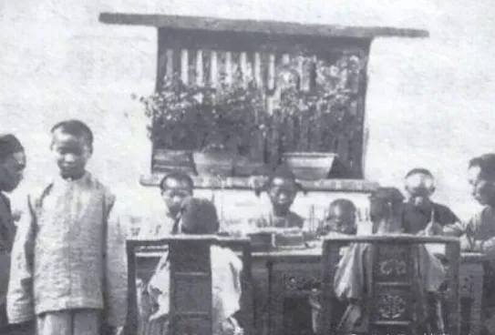 这张就是清末的私塾局面,长桌上一圈人,先生坐首位,学生垂头坐着听书,有个孩子站着,有点像刚被先生叫起来背书,屋里没几样家具,但大家神色格外认真,爷爷说那时候“要偷着听窗外有笑声”,被罚站就是大事,书桌都是老樟木,一挨近就有股药味儿,那种规矩劲,现在真难找到了。