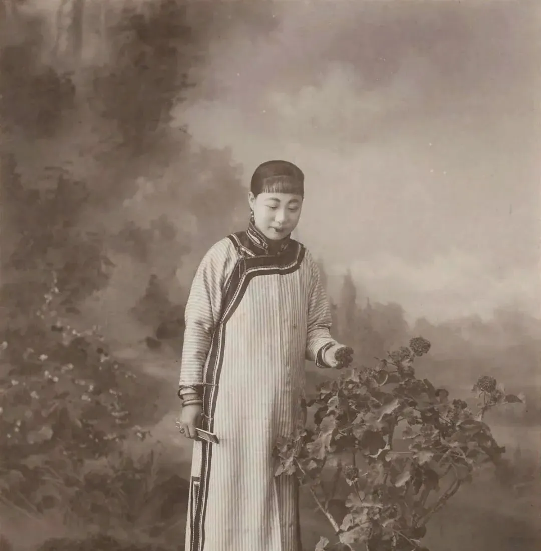 这张像是旧时的闺阁留影。衣裳线条很直,领口、滚边都收拾得利落,手边还扶着花枝。那时候拍照不是随手一按,得站稳、收神,连眼神都要端着。衣服不只是穿暖,也是一个人家教、身份和体面的外面文章。