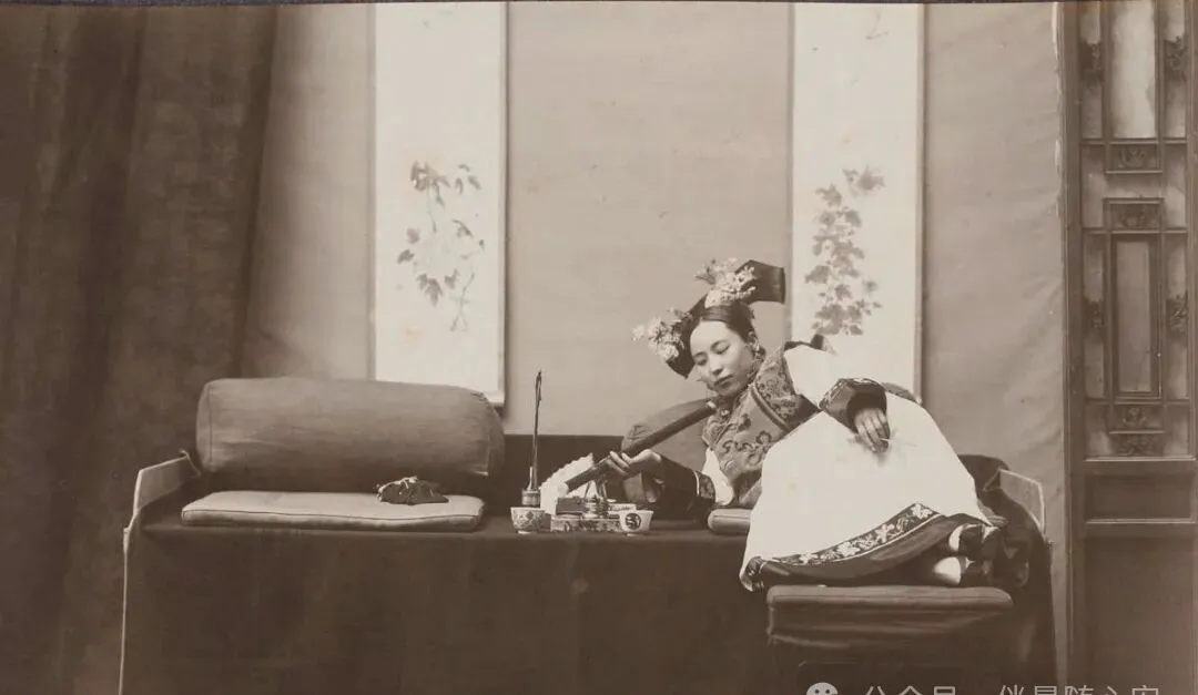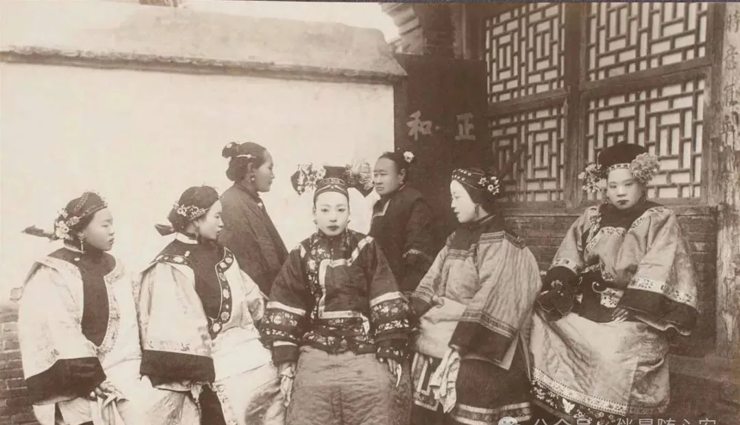 几位女子围坐在院中,衣襟、头饰各有讲究。这样的场面,像是大户人家女眷闲坐,也可能是特意摆拍。可就算是摆拍,也能看出旧时院落生活的样子:人不急,话不响,坐着做针线、闲聊、照看小辈,一下午就过去了。