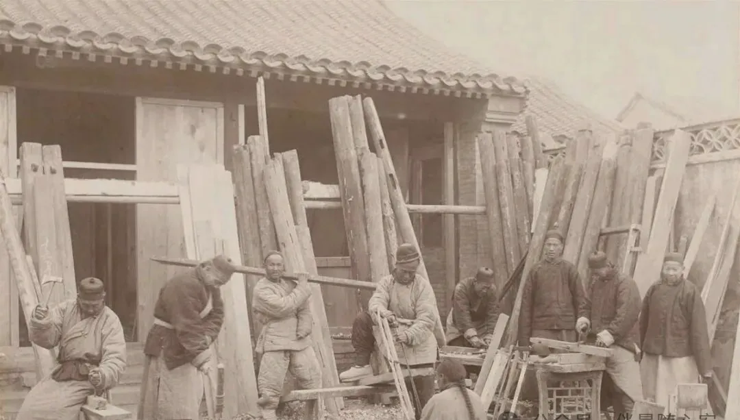 院里堆着大木料,几个人正在做活。看着像木匠、也像搭建房屋时的工匠班子。以前做门窗、梁柱、桌凳,全靠刨、锯、凿一点点成形。木头的纹理、锯开的声响、刨花卷起来的手感,都是老手艺里最实在的东西。