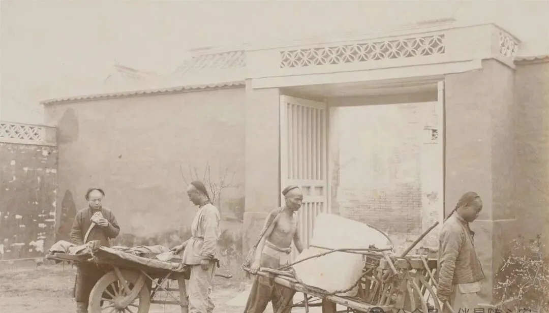 门外几个人推着车经过,车上装着东西,也像载人载货两用。那时候没有小货车,巷子里最顶用的就是人力车、板车、独轮车。搬家、送货、拉柴米,什么都靠人一步一步推。路不算长,可活是真沉。