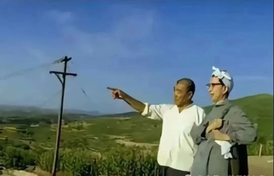 一人伸手指向远处,这个动作特别有画面感。老一辈看土地,不只是看风景,是看庄稼、道路、水源,也看往后的日子怎么过。那时候很多照片都拍在田边、坡上、村口,因为人和生活的重心,本来就落在这些地方。