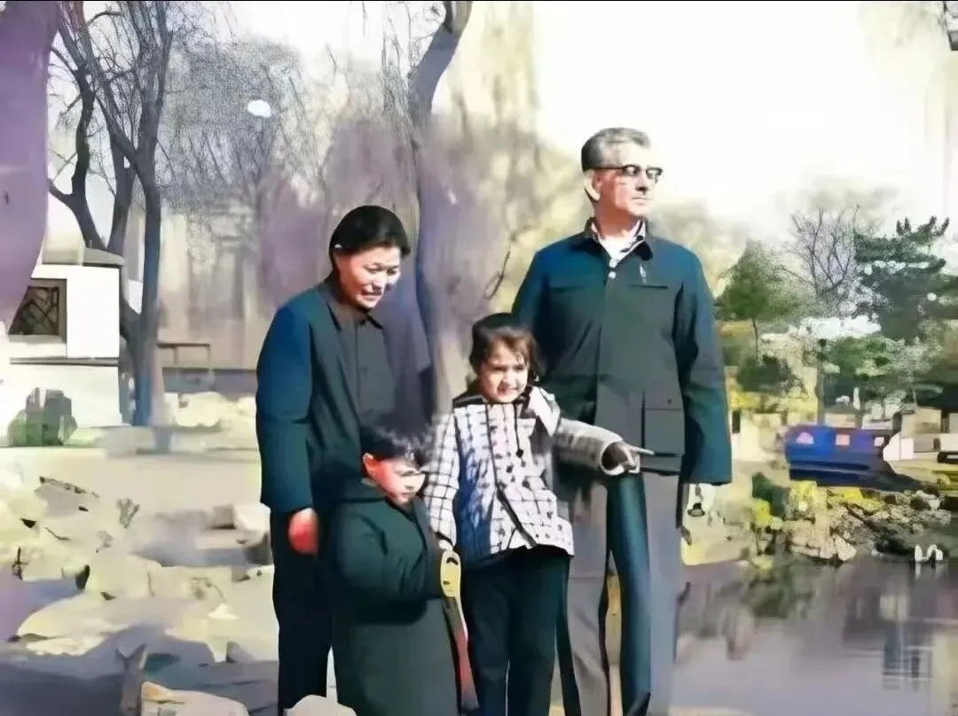这张图一下就近了。大人照看着孩子,孩子站不住、看不稳镜头,反而让照片活了起来。过去出门留影不像今天这么随意,能一家人到园子里、景点边拍一张,已经是值得记住的事。你看见的不是摆拍,而是一个家庭真实的相处样子。