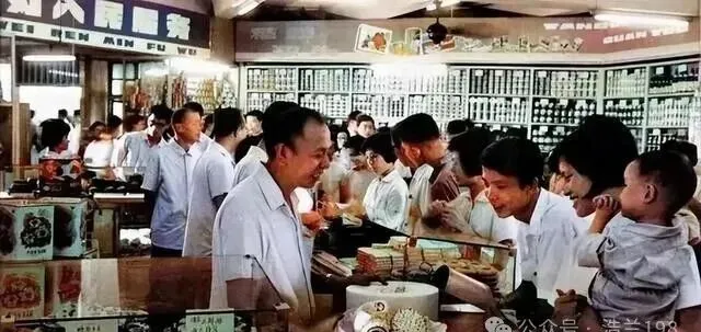这张是供销社营业大厅,柜台里外人挤人,柜姐白制服,后头货架塞满搪瓷缸、小台扇、细瓷碗,前头买家拿小票簿撕半天,哪一把钱都算着用,每逢节假日全家齐上阵,小孩趴在玻璃橱窗前盯着巧克力和罐头,爸爸在收据上摁手指,妈妈抠着算账,手指间老茧一层又一层,队伍里谁都着急等,张口全是家常里短,这热闹气儿现在超市找不到了。