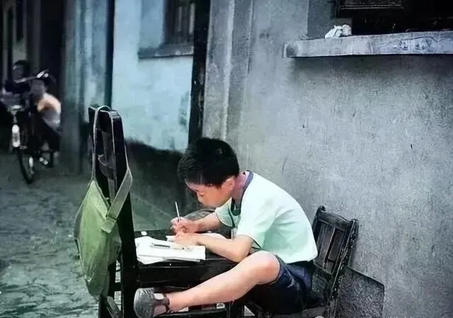 这个弄堂写作业的小男孩,一个人凳子一歪,桌子斜靠墙,一脸正经拿铅笔写着算数,布书包肩上吊着,鞋后跟都快踩破了,外头自行车叮铃铃过一趟,小孩头也不抬,就是专心,这种马路边写作业的劲头,放现在人都说条件太艰苦,那时候谁管啊,家里没空位全靠自觉,写完就下来跑步丢沙包。