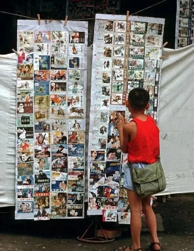 这个摊儿是小人书摊,搭着绳子挂成墙,五毛一本三毛一本,各种英雄故事、侦探连环,墙角缺口的那本《水浒传》被翻得掉皮,排队看一遍又一遍,只要有新货来了,半条街的男孩子女孩子全来了,想租借的得靠点运气,攒零花钱排老早,有时候和小伙伴靠在一起看完一卷章回,回家路上都舍不得放下,爸妈说书看多了眼睛要花,嘴上嫌,书还是舍不得收走。