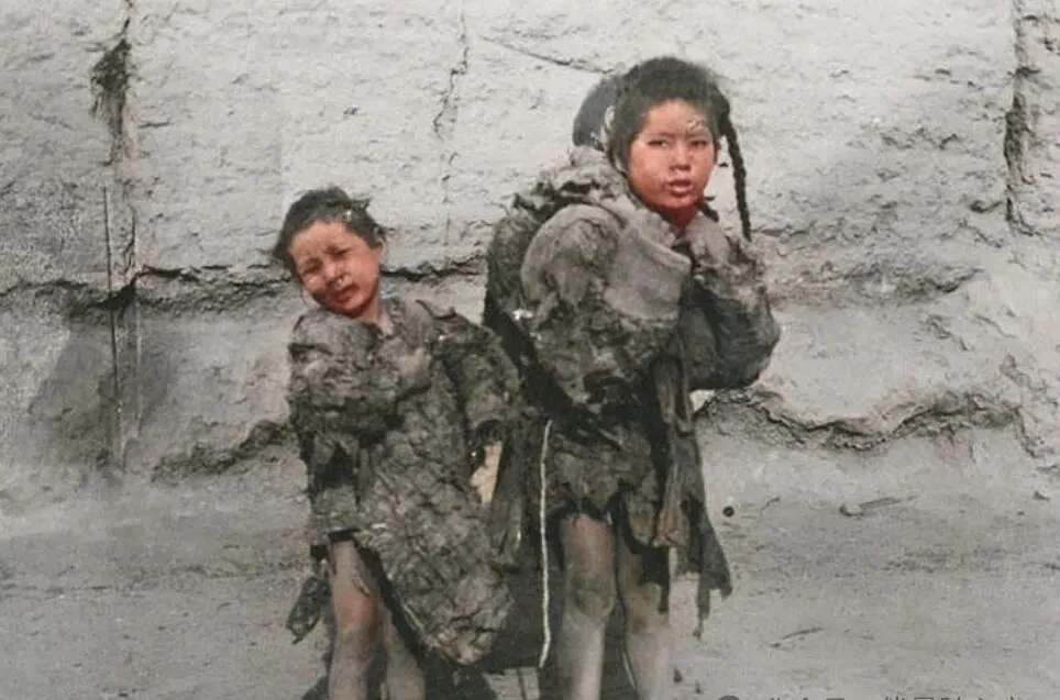 两个孩子身上裹着破旧衣物,背后像是柴火或杂物。这样的活,过去穷人家孩子都早早上手,捡柴、拾煤、背草,肩膀小,担子却不轻。旧日子的苦,不是说出来的,是背出来的。