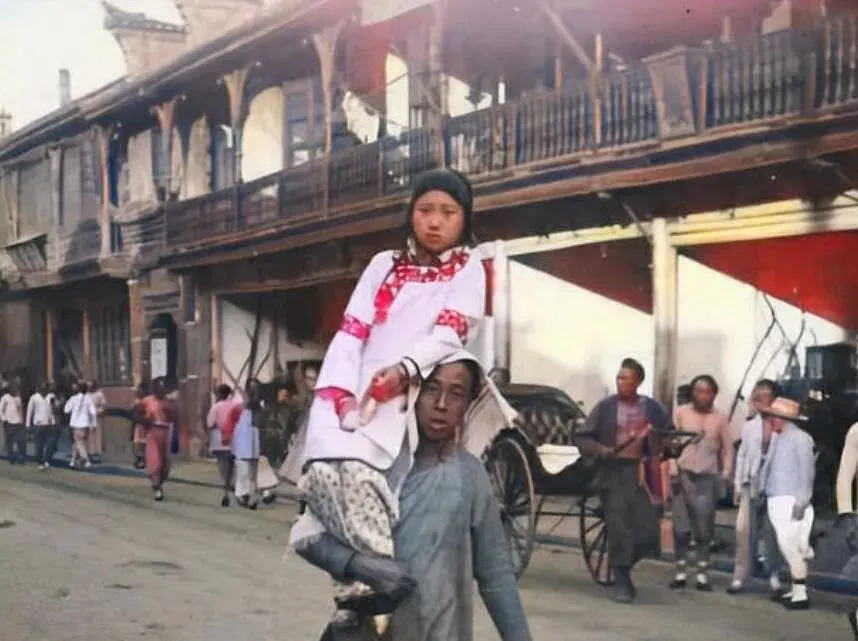 这张很有旧上海的味道,像是把青楼女子送到客人处的“外卖”场面。过去有些行当,体面话说得漂亮,背后其实全是人情和买卖。有人坐在别人肩上,不是她脚不沾地,而是那年月里,连风月场都讲究送到门口。