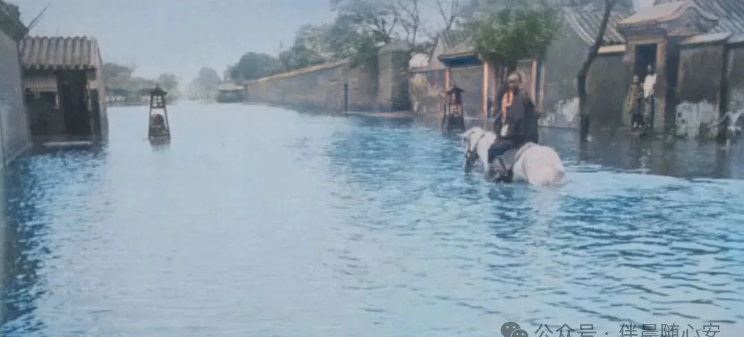 街道整个淹平,只能靠骑马或骑驴慢慢探着走。这样的场面今天看少见,旧时却不算稀奇。没有抽水车,没有应急队,谁家有牲口,谁家就多一分挪动和逃险的本钱。