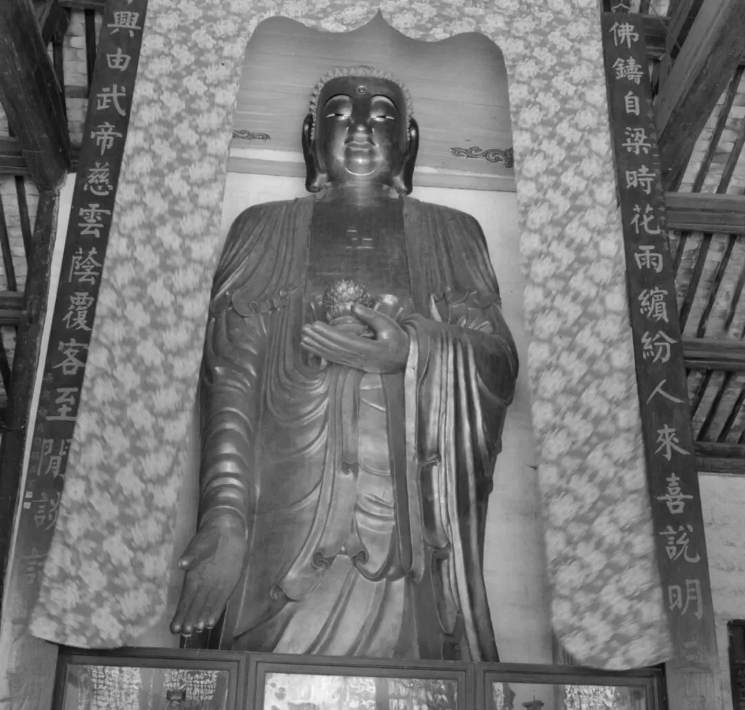 这个立着的大佛像,手势不一样,衣褶顺着往下垂,背景是一整面寺庙的墙,站在面前有点压抑,奶奶总说“佛大压邪气”,其实自己小时候更怕高大的影子,佛像身上岁月的痕迹全看得见,砖墙边还贴了对联,写的都是祈福求安。