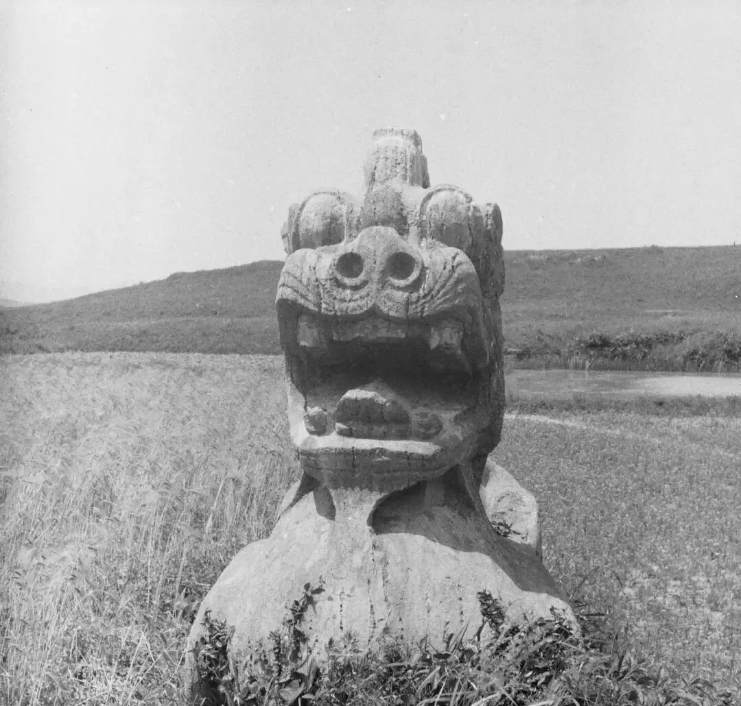 这尊舌头伸得老长的石兽,样子很憨厚,石身厚重朝着地面一坐,仰着头露着一副呆样,有人说这是守陵的兽,有人说其实就为讨个吉利,麦苗都快把兽腿盖住了,再过几年怕是连脑袋都看不见,真是年头太深远。