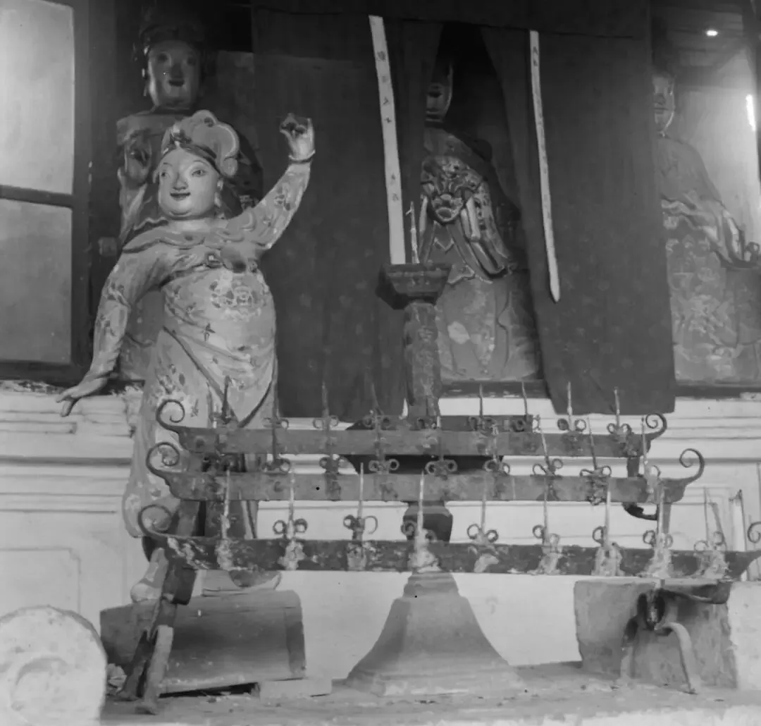 这一排泥塑神像站在庙檐下,前排还有一排铁制灯架,造型稍显滑稽,小时候最喜欢趴在窗外看泥人脸上的表情,最左边这尊还举着胳膊好像在跟人打招呼,一屋子泥人总比真人热闹,现在摆在寺庙深处,外人难得一见。