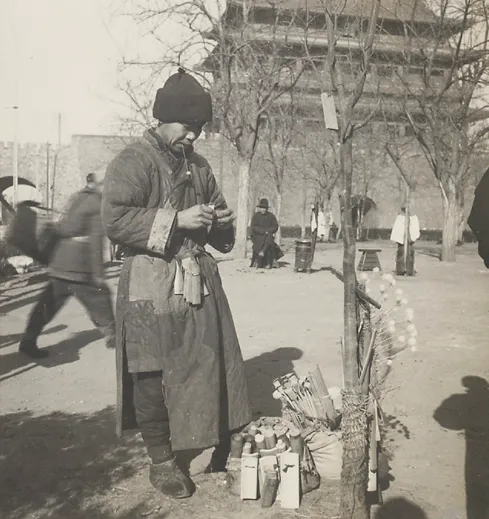 ------------------------------------------------------------------------------------------------------------------------------------------------------------------------------------------------------------------------------------------------------------------------------------------------------------------------------------------------------------------------------------------------------------------------------------------------------------------------------------------------------------------------------------------------------------------------------------------------------------------------------------------------------------------------热气腾腾的烧饼摊。烧瓶小哥满脸疑惑,似乎在问:要不要来一个?茶饮摊。喝茶就喝茶,可千万别惹摊主,看这模样,功夫一定了得!摊主这呦呵劲,可高兴了!不过这地摊设备罕见,到底是买啥的呢?葫芦摊。一个藤上七个瓜,各具特色的小葫芦,任君挑选!水果摊。让人难以想象,这摊子竟然是摆在一百年前的天安门前!盂类器具摊。缺痰盂、夜壶不?质量杠杠的,可以放心购买!古玩摊。各种陶瓷、首饰应有尽有,摊主还是个小可爱!日常用品摊。锅碗瓢盆、拖把、水桶...走过路过别错过!贴身用品摊。耳罩、腰带、钱袋...一人、一竹竿就是一摊位磨刀摊。人群密集,看来古人的“磨刀不误砍柴工”诚不欺我!日常小工具摊。挠背、掏耳、针线...帮助你解决日常小烦恼。扇子摊。扇子除清凉去暑之外,还是风雅人士手持的日常装扮。这就是100多年前的地摊市场