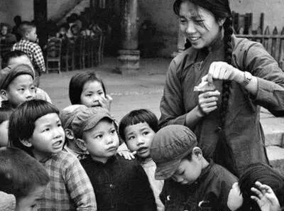 这张照片里的麻花辫老师,旁边一圈小孩抻着脖子看她手上那小包玩意儿,这场景太熟了,八十年代的幼儿园课间分零食,老师上课板着脸,下了课一笑,眼神都软了,手里挤着点糖果或者瓜子,小孩眼神贼亮,哪怕只是一小捏糖豆,那都是全班讨论半天的大事;