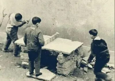 这个石头墩子加青砖的组合,就是图里的简陋球台,光说破,其实那是孩子们自制的豪华装备,球桌不平,两头用砖块垒个简易网,球拍连胶皮也没几块,泥巴浆糊抹过了也照样开打,打一会,球还卡进墙根缝隙里,得钻进去掏;