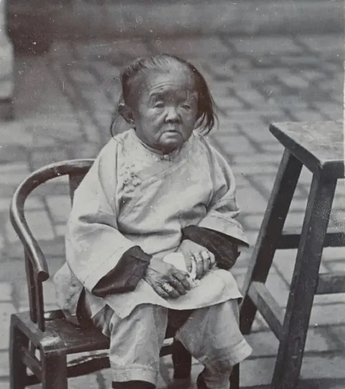 照片里的女子坐在小木椅上,身量矮小,神情却很平静。椅子是旧式靠背木椅,过去人家里、铺子里都常见,搬起来不算重,坐上去却端端正正。她身上的袄褂像是家常穿的,宽大、耐磨,袖口磨旧了也照样穿。这样的照片,未必是富贵人家留影,更像是把一个特殊身形的人当作“奇观”拍下来。旧时代里,很多人的命运并不由自己决定,连被观看这件事,也常常无从回避。