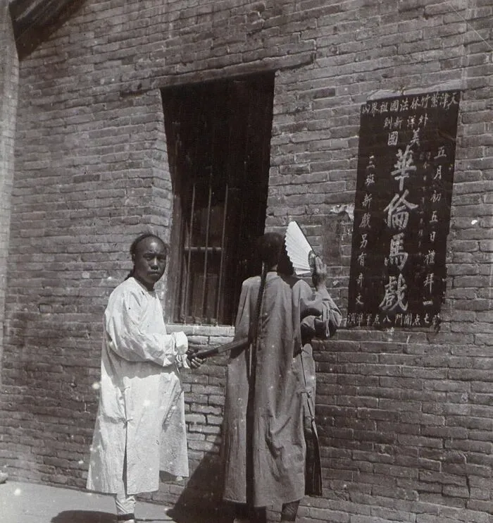 这张看着像一面普通砖墙,可真正扎眼的是墙上的告示。那时候城里乡下,许多事情都靠张贴布告、榜文来传开,纸一糊上去,谁家犯了事、哪天要办什么、官面上怎样处置,街坊很快就都知道了。旁边人站着看,手里还拿着折扇,像是路过,又像是特意停下。旧日子的消息传播,没有手机,没有喇叭,可一张告示贴出来,巷口茶棚、街边铺面,很快就会把它说热。
