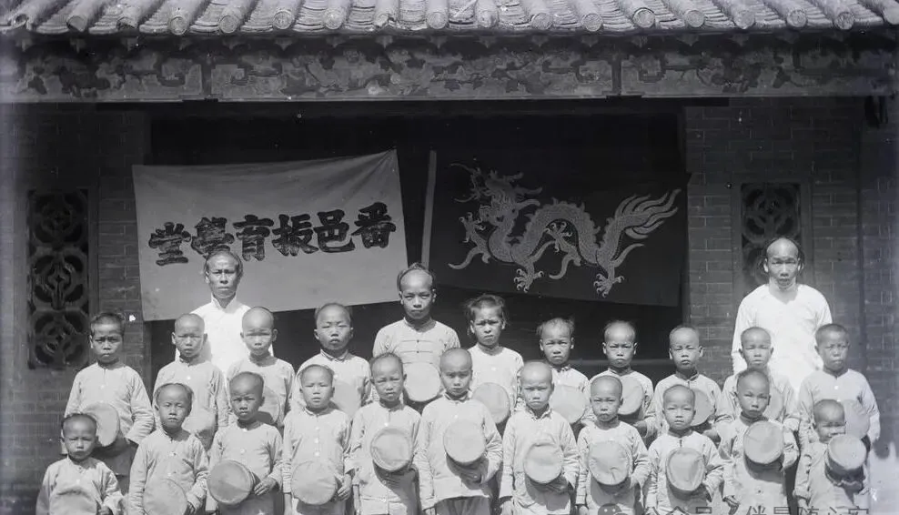 这一张是旧时私塾或蒙馆合影。孩子们脑袋剃得整齐,手里捧着圆帽,站得一脸认真。这样的地方,多半是先认字、背书、学规矩。先生坐堂,孩子们一排排站好,早晨进门先收心,随后就是一句句跟读。那时候念书不是一件轻松事,背不下来要挨训,字写不好要重来。可对不少人家来说,能把孩子送进这样的地方,已经很不容易。一顶小帽、一身布衣,后头往往是全家省出来的指望。