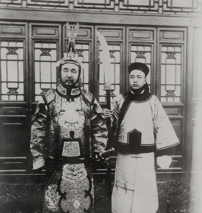 这一张里,最有分量的就是那身铠甲。甲片、护胸、头盔、佩刀,全是身份和军功的外在样子。站着不动都觉得沉,更别说真上阵时要穿着它行军、指挥、应战。晚清军中人物拍照,常会把最能代表身份的行头穿戴齐整,因为这不只是留影,也是立威。旁边侍立的人同样衣冠整肃,一看就知道主次分明。照片虽然静,可仍看得出那个时代对威严、等级和体面的看重。
