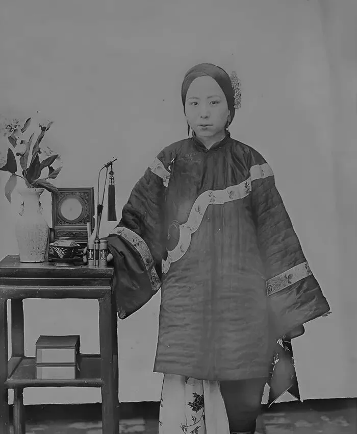 女子靠桌而立,穿着宽袖袍褂,头上簪花,边上摆着花瓶、小镜座一类陈设。这样的摆拍,在晚清已经不算少见。照相馆里常备桌椅、瓶花、帷幕,让人站进去,像是在自家屋里一样。可细看衣裳,仍能看出当年人的穿法:袍子宽、料子厚,讲的是端庄,不图轻便。桌上的器物放到今天,很多都被化妆镜、装饰台替代了;可在那时,这些小东西不只是好看,更是女人收拾衣饰、见客待人的体面。