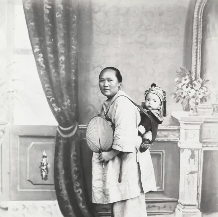 妇人背着孩子,手里还拿一把团扇。这样的背法,很多地方都用过,拿布一兜,孩子贴在背上,大人还能腾出手做事。做饭、走路、串门、看顾活计,都不耽误。孩子在背上晃着晃着就睡着了,大人热了就摇两下扇子。别看只是个简单动作,里头全是旧日子里的操持劲。今天有婴儿车、有腰凳,可那时一块布、一双肩,就把孩子从小背大。