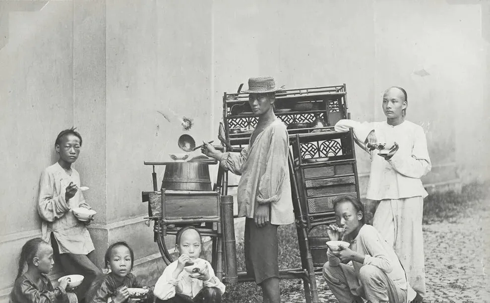 最后这一张,是走街串巷的挑担吃食。担子中间放锅,旁边是碗筷、料盒和小抽屉,走到哪儿卖到哪儿。孩子们围着吃,手里捧着碗,蹲着站着都顾不上讲究。这样的流动食担,像是旧时最灵活的小饭铺,谁饿了谁就来一碗。锅盖一掀,热气往上扑,勺子碰着锅沿叮当作响,汤面、粥饭或小吃的香味,常能把半条街的人引过来。旧生活再苦,热饭热汤总是最实在的安慰。