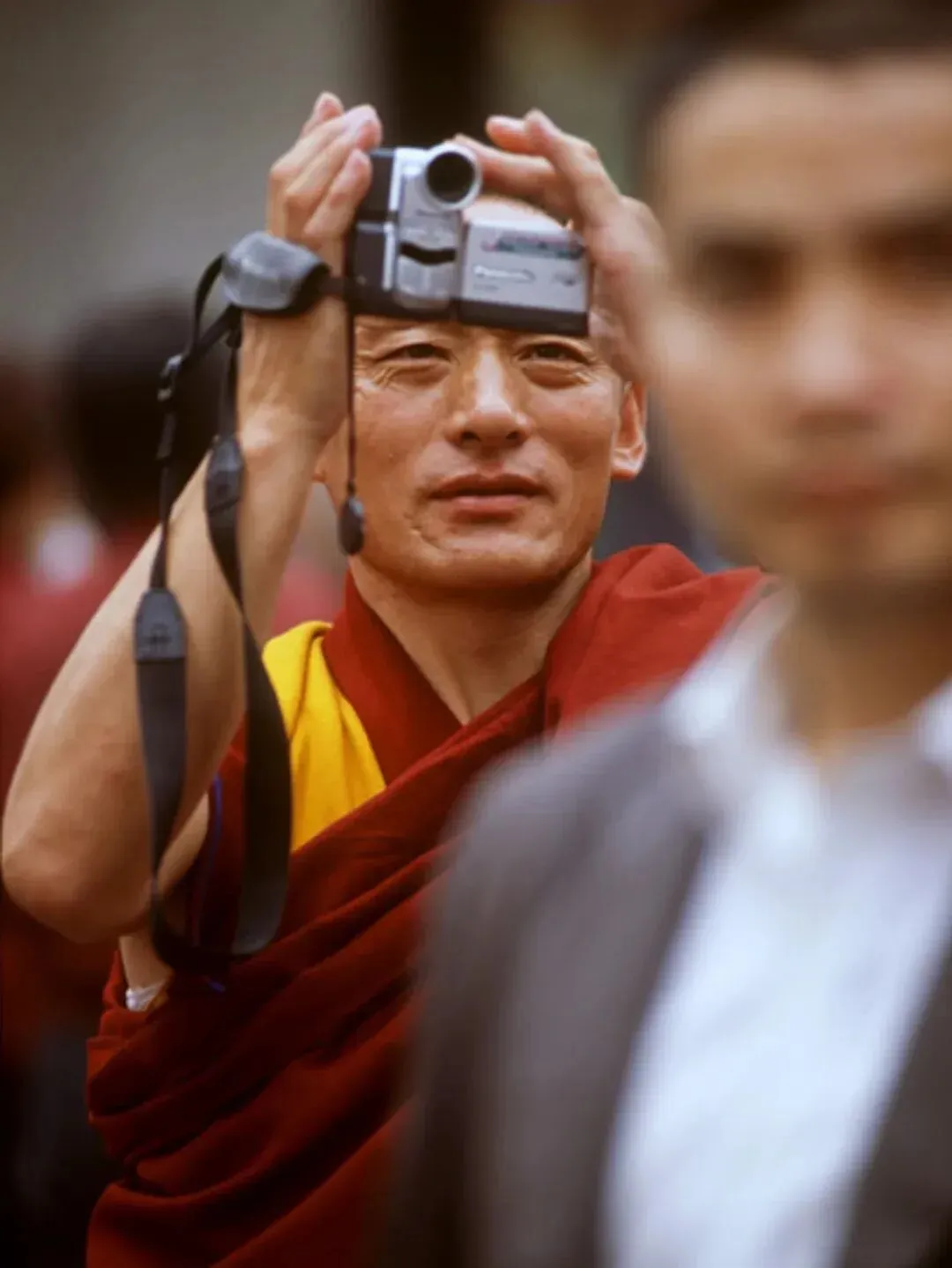 成都老照片:2004年,成都街头一景,镜头中一个藏传佛教的僧人穿着僧服正举着一个相机拍摄着啥,眼睛里透露出专注和好奇