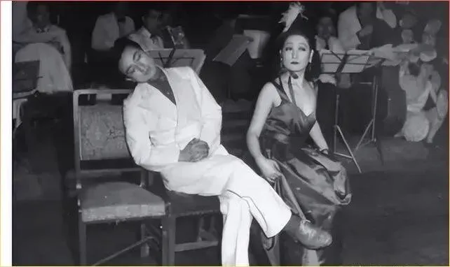 这张照.片拍的应.该是.某个剧场或者演出现场,台上坐着穿白.西装的男子.和穿黑礼.服的女士。那个年代能看.上这样的.演出,可都.是有身份有地位的人物。普通老百.姓想都不.敢想,只能在.外面听听热闹。