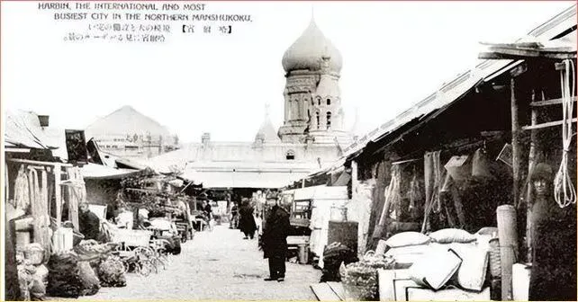 最接地气的.还得数.这张.!街.道两旁都是.小.商铺,人来人往,特别热闹。远处还.能看见清真寺的.圆顶.,说.明当时东北各民族就已经和睦相处,共.同生活.在这片土地上了。