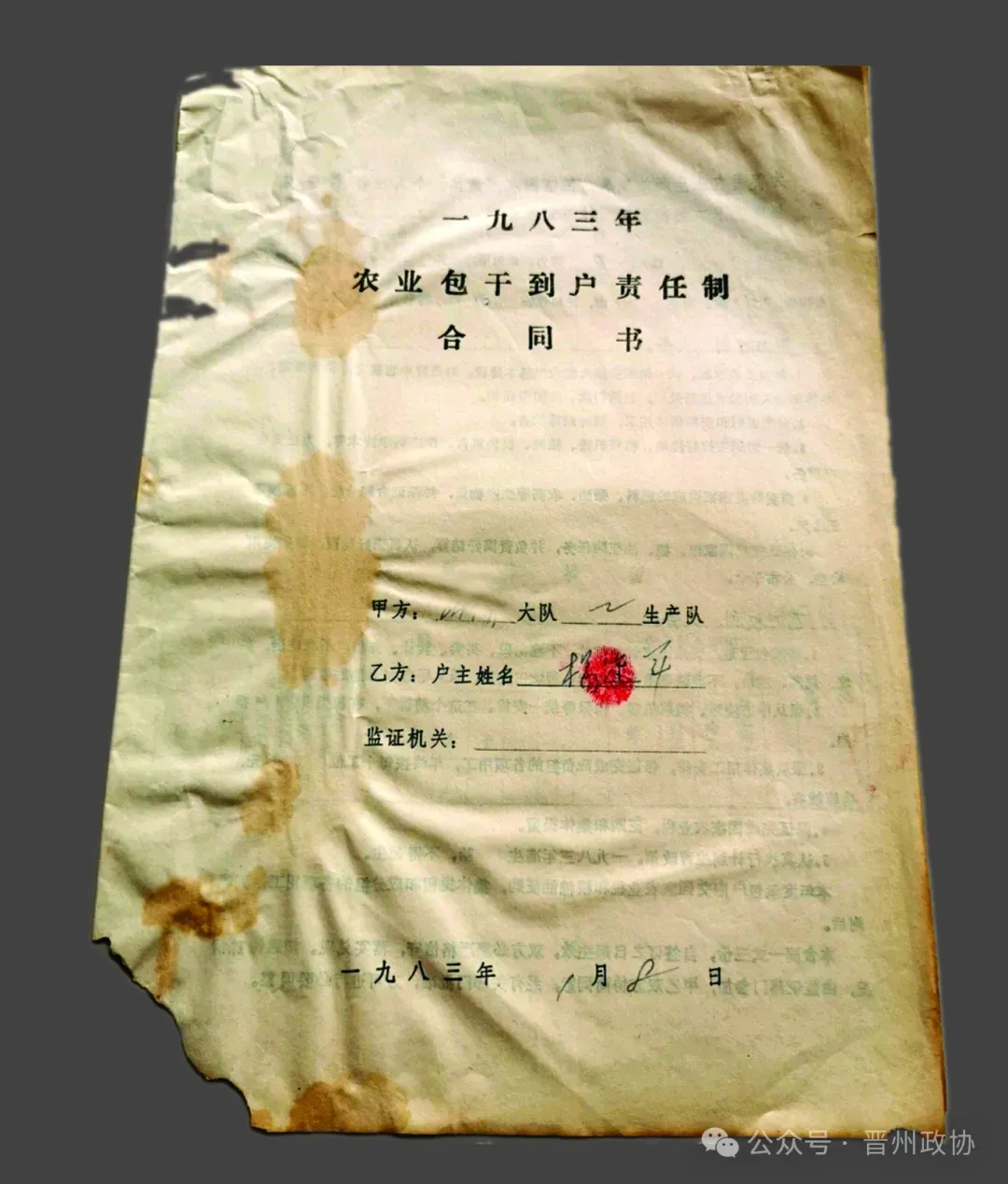 大包干。1979年,全县贯彻中共十一届三中全会精神,农村出现了小段包工、联产到劳、包产到户等多种形式的生产责任制。1981年10月,全县1312个生产队实行小麦联产到劳责任制,占生产队总数的91.9%。1983年1月,除周家庄公社和吕家庄大队外,全县农村实现耕地家庭联产承包责任制(即大包干)。同时,集体工副业也开始由户、联户或专业队承包经营。随之,以商品生产为特征的专业户、重点户、经济联合体在农村大量涌现。图为1983年1月8日,农民与生产队签订的包干到户合同书。