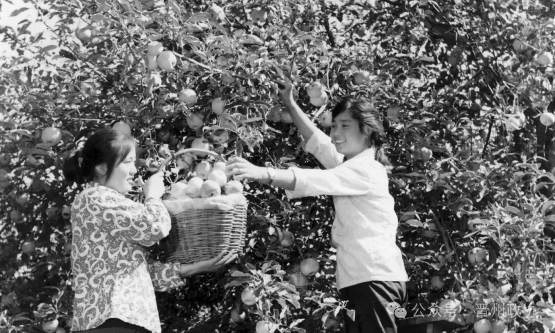 1989年,周家庄乡果农正在采摘丰收的果实。改革开发后,特别是在棉花销售不再火爆后,晋县开始大力调整农业生产结构。1983年,全县推行果树生产责任制,推动了梨果业发展。1990年,全县果品总产9112.5万公斤,收入3785万元。